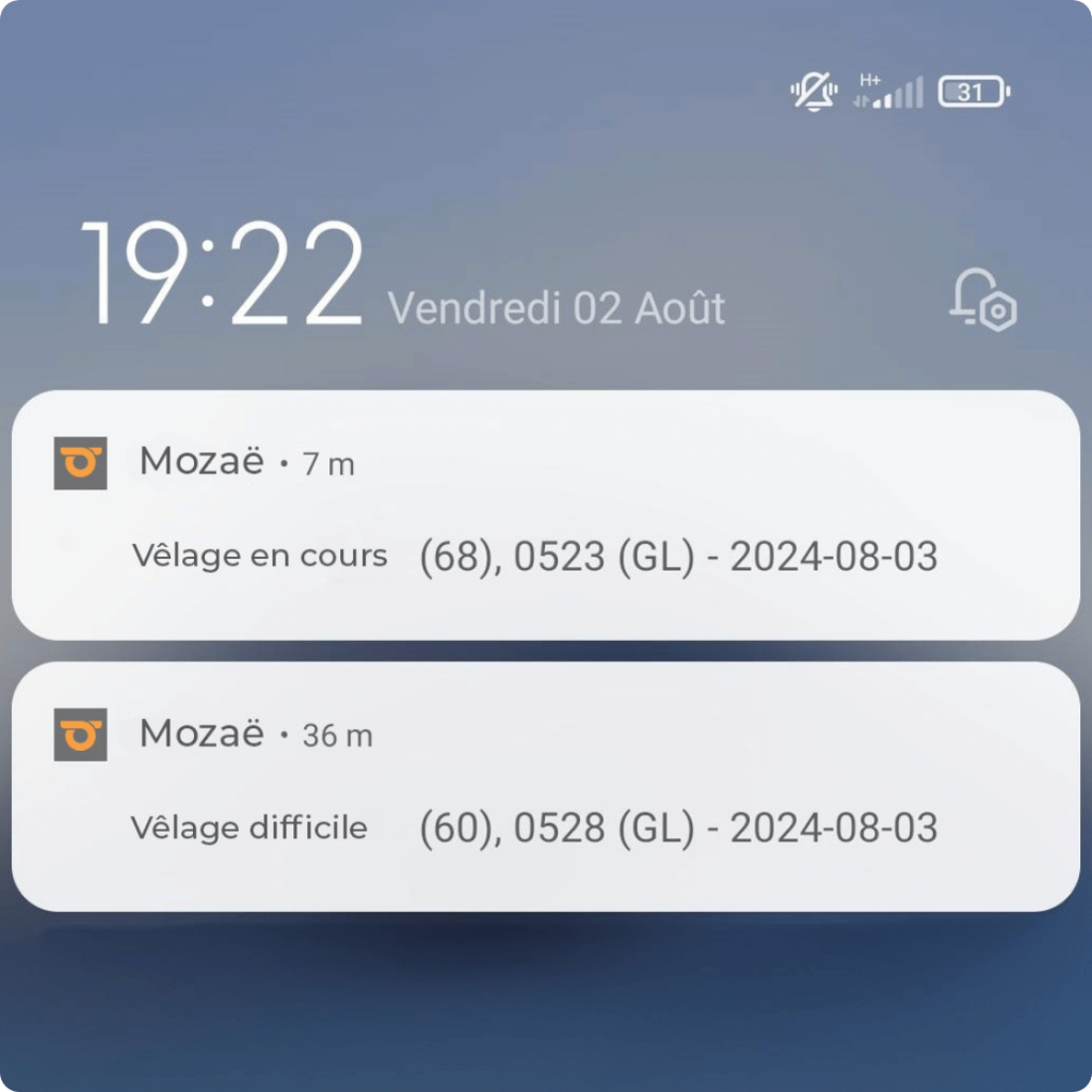 Mozaë permet de détecter 99 % des vêlages difficiles grâce à l’analyse des mouvements caractéristiques de la vache avant le vêlage (changements dans l’activité debout/couchée ou la baisse de rumination…). Vous recevez une alerte vous informant que la vache est en train de vêler. Vous intervenez au bon moment pour aider l’animal.