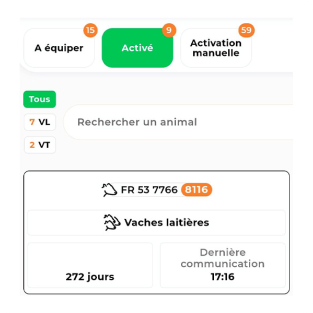Si vous avez une date précise d’insémination ou de saillie naturelle, le service de détection des vêlages va s’activer automatiquement quelques jours avant le terme. Si votre femelle n’est pas équipée alors qu’elle entre en surveillance de vêlage, elle sera mise en avant directement sur votre tableau de bord.